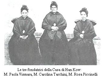 M. Rachele Tronconi, prima superiora di quella Comunità dopo la partenza di M. Lucia Cupis, registrò questo momento nella sua prima circolare annuale: " Sul fine del mese di luglio1868 c'imbarcammo a Hong Kong per avviarci alla volta di Hankow nel Hupeh, Vicariato di Mons. Vescovo Zanoli e, grazie al buon Dio, approdammo felicemente...".